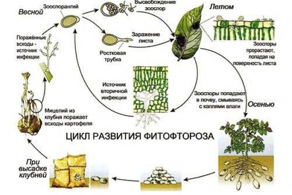 Les feuilles atteintes se dessèchent, les pédoncules se dessèchent également et les inflorescences noircissent. Les fruits des plantes malades sont recouverts de taches brun-brun difficiles au toucher, qui poussent en surface et en profondeur, puis se ramollissent et commencent à pourrir. Sur les tubercules de pommes de terre infectés par le mildiou, apparaissent des zones grisâtres avec une peau ridée, sous lesquelles, une fois coupées, on peut voir les "langues" des tissus rougeâtres affectés par le pathogène se propager vers l'intérieur. Pas étonnant que le mildiou soit également connu sous le nom de pourriture brune ou pourriture de la pomme de terre. Les tubercules affectés par cela, à première vue, et les fruits verts mûrissants deviennent non comestibles même après un certain temps après la récolte, et les plantes malades meurent souvent. Au milieu du 19ème siècle, une épidémie de cette maladie en Irlande a affecté la quasi-totalité de la récolte de pommes de terre, provoquant famine et immigration massive dans le pays.