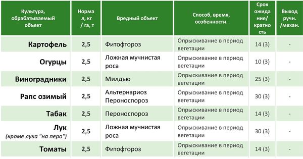 Les concombres et les oignons nécessitent 3 traitements au cours de la saison. L'intervalle entre les traitements est de 10 jours. En cas de pulvérisation trop fréquente, la partie végétative de la culture peut se faner.