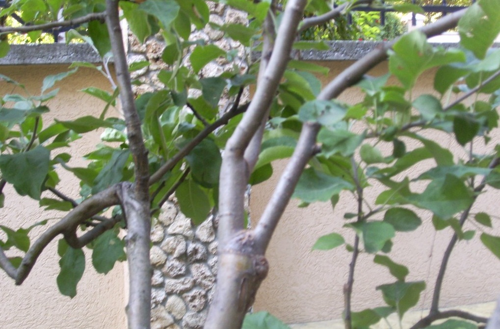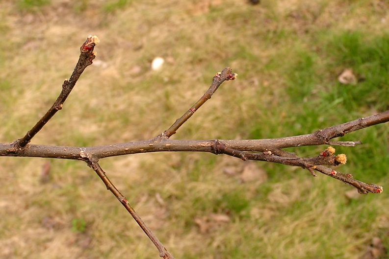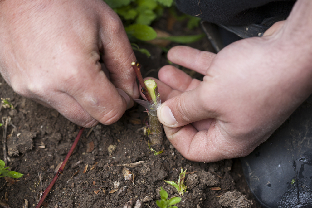 Les bourgeons qui sont à l'opposé des tranches sont enveloppés de ruban adhésif et les deux bourgeons suivants de la bouture greffée devraient pousser. La coupe au-dessus de ces bourgeons doit être recouverte de poix de jardin. S'il y a des pousses sur le porte-greffe en dessous du point de greffe, elles doivent être coupées. Il est conseillé de traiter toutes les plaies avec du vernis de jardin.