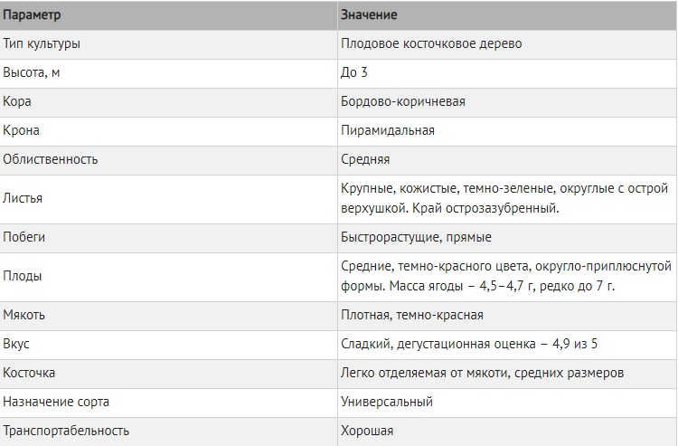 Les fruits sont de forme ronde, mais légèrement aplatis. Les baies ont une taille moyenne - environ 5 g. Mais il peut y avoir de gros spécimens atteignant 7 g. La peau est dense, brillante, écarlate foncé, presque noire. Il y a une petite tache blanche à la base de l'apex. La pierre est de forme ovale, bien séparée de la pulpe. La pulpe est dense, de couleur rouge foncé.