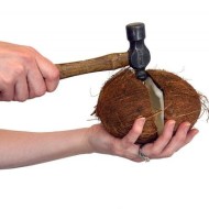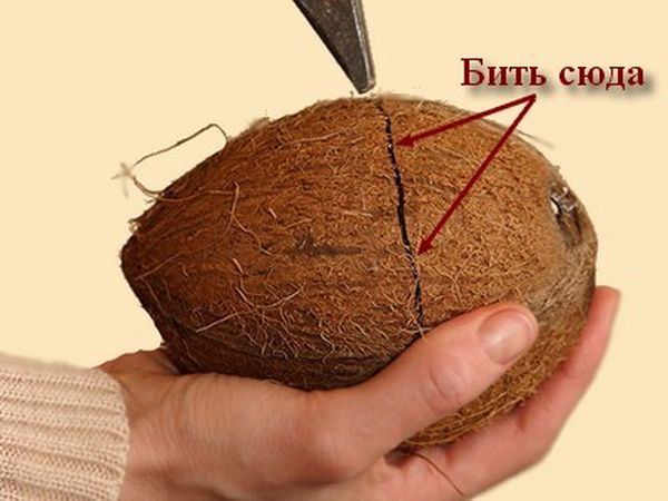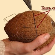 Ensuite, vous devez hacher la noix de coco. Un marteau ordinaire vous aidera. Ils doivent tapoter légèrement sur toute la surface du fruit. Une attention particulière doit être portée à l'endroit où le tire-bouchon est vissé, car c'est là qu'il sera plus facile de faire une fissure.Après son apparition, il ne sera pas difficile de diviser le fœtus en deux moitiés.