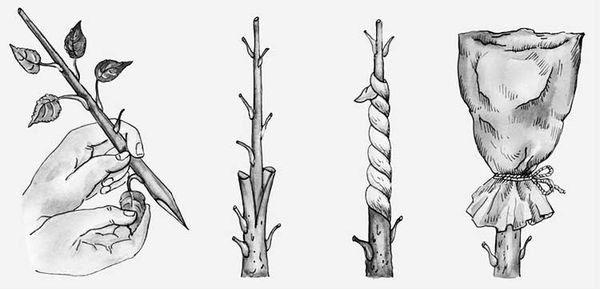 Pour greffer avec un œil sur l'écorce d'un stock préalablement nettoyé, une incision est pratiquée en forme de lettre "T", un greffon est inséré dans la fente et le ruban est fixé de manière à ce que le bourgeon soit ouvert. La surface est traitée avec du vernis de jardin, la culture est fermée avec un sac ou une bouteille en plastique. Il s'avère une mini-serre avec un microclimat approprié.