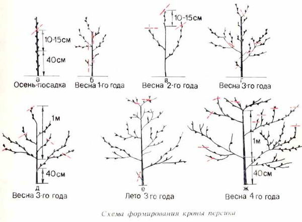 La période de l'année choisie pour la procédure dépend également du but de la taille. Ils commencent à tailler le pêcher dès la deuxième année après la plantation, lorsque la plante est complètement ouverte, elle a plusieurs pousses latérales. La formation des futures branches squelettiques commence à partir de ces pousses.