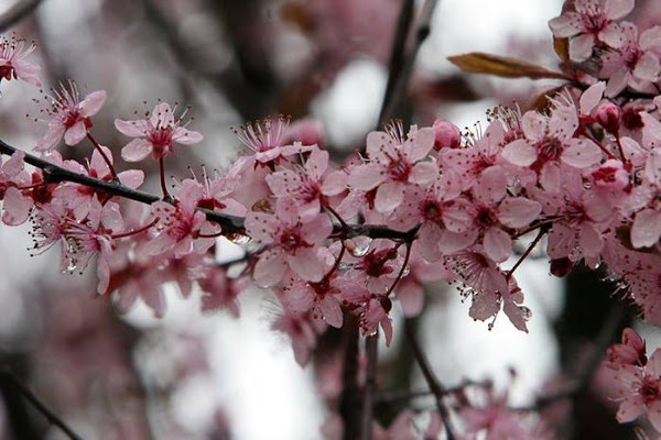 Les bords des feuilles sont dentelés ou doubles. Dans chacune des belles inflorescences, vous pouvez voir environ 4 fleurs - grandes, en forme de soucoupe, avec des pétales arrondis. La fructification de cette variété de cerise est mixte. Les fruits apparaissent à proximité les uns des autres, 1 à 2 chacun, leur poids peut atteindre 5 g. Ils ont une couleur rouge foncé, ils sont plats et ronds, la couture est située près du sommet. La pulpe est rouge foncé, les fibres sont parfaitement visibles, avec un goût raffiné et agréable.