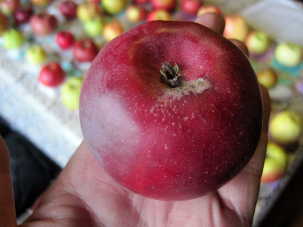 Les pommes rondes à la chair crémeuse et légère à grain fin ont un poids moyen de 170 g, poussent et plus - 200 g. Elles ont un arôme très agréable, un goût de dessert - sucré avec de l'acidité. La peau fine mais assez dense a une couleur verte qui, à partir de la fin de l'été, commence à se couvrir d'un blush rouge foncé et au début du mois d'octobre, période de pleine maturité, les pommes deviennent rouge foncé. Ils sont si juteux qu'ils peuvent se fissurer lorsqu'ils tombent au sol.