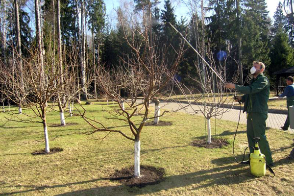La première étape tombe à la mi-mars. Il est important que l'air se réchauffe à +5 degrés et que ce chiffre soit stable. À ce stade, ils s'occupent des parasites qui ont hiverné avec l'arbre, mais qui ne sont pas encore entrés dans la phase active. Ils effectuent des mesures préventives contre diverses maladies.