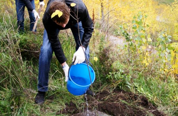 Ensuite, il est recommandé d'attacher le semis à 1 à 3 piquets afin qu'il soit résistant au vent. Pour les jardiniers de l'Oural, de la région de la Volga, de la Sibérie occidentale et d'autres régions où des vents forts règnent toute l'année, il est recommandé d'entourer le plant de piquets de tous les côtés ou de les placer dans le sens des vents dominants. Il est préférable de faire la jarretière avec un chiffon doux ou un film, car la ficelle peut endommager la jeune écorce tendre. N'oubliez pas de faire une soi-disant "soucoupe d'arrosage". Il est impératif d'arroser la plantule après la plantation même par temps de pluie ; les jours suivants, il ne faut pas abuser de l'arrosage. Si vous plantez plus d'un semis, la distance entre eux doit être d'environ 4 mètres. Parfois, il arrive qu'un semis soit acheté, mais vous n'avez pas assez de temps pour le planter. Creusez une petite fossette, mettez-y un semis, saupoudrez la racine de terre et arrosez bien. Ainsi, vous pouvez stocker l'arbre pendant une semaine par temps nuageux ou pendant 2-3 jours chauds et ensoleillés.