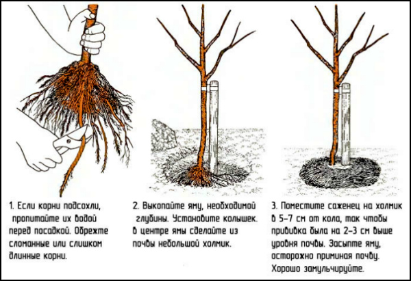 Pour la plantation, il vous faut un trou de 60 à 70 centimètres de profondeur, suffisamment large pour accueillir sans problème un semis aux racines redressées. La fosse est remplie d'un mélange d'humus (4 kilogrammes), de superphosphate (40 grammes), de potassium (20 grammes) et d'urée (20 grammes). Afin de ne pas brûler les racines, saupoudrez l'engrais avec de la terre propre, en formant un petit monticule sur lequel vous placez le plant. Attachez-le à la cheville de support et commencez à remplir le trou avec de la terre. À la fin de la procédure, arrosez abondamment le plant en versant de l'eau jusqu'à ce qu'il soit absorbé.