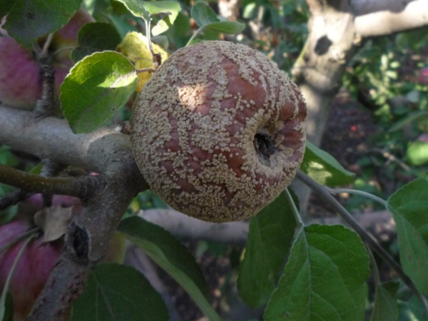 En cas de dommages dus à la pourriture des fruits, des fissures et de petits ulcères apparaissent sur les pommes, qui se transforment en foyers de pourriture. Peu à peu, la pomme pourrit complètement. Lorsqu'une gale est touchée, les feuilles sont touchées, puis les fruits.