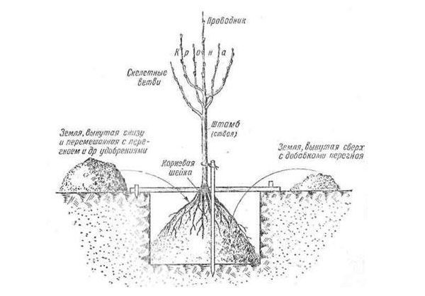 Il est préférable de planter des arbres dans des zones au sol fertile, où il n'y a pas d'eau souterraine à proximité. L'endroit doit être ensoleillé, les indicateurs de rendement n'en souffriront pas. Les plantations d'automne et de printemps sont autorisées. Les trous de plantation sont formés de 50 * 100 cm, remplis d'un sol fertile avec des engrais: un mélange de potassium, de superphosphate, de cendres et de fumier pourri. Les trous sont formés à environ 3 m les uns des autres.