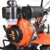Tracteur à conducteur marchant à essence à usage professionnel. L'unité est équipée d'un moteur puissant, d'un volant réglable et d'un ensemble de couteaux de cultivateur. La présence de l'ouvre-porte permet d'installer divers accessoires sur le cultivateur.
