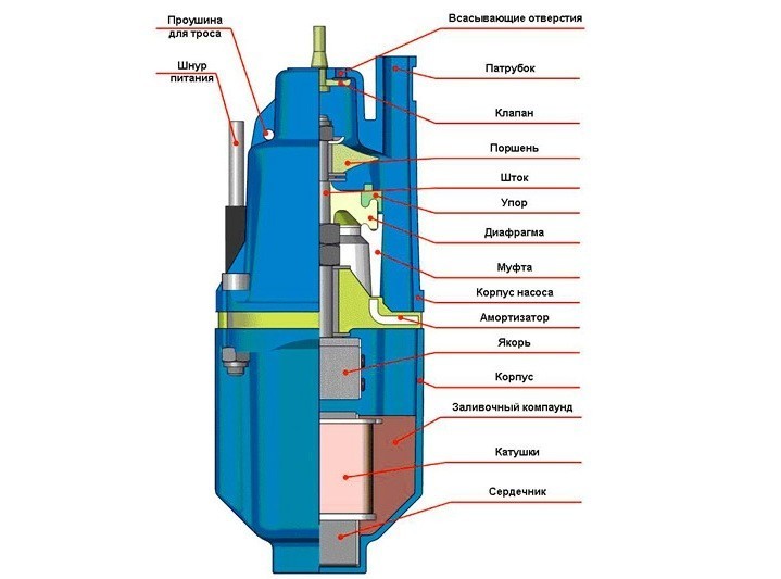 La machine effectue le pompage de liquide en raison de la vibration d'un piston spécial. Le courant électrique alternatif dans l'enroulement de l'appareil magnétise l'armature, qui commence à osciller de haut en bas. Ces vibrations sont transmises mécaniquement à une tige de piston spéciale. Lorsque le piston descend, une zone de pression réduite est créée dans la chambre de travail de la machine hydraulique. De ce fait, du liquide est injecté dans la chambre. Pendant le mouvement inverse, le liquide est projeté hors de l'appareil dans le tuyau et acheminé vers le haut. Des itérations constantes de ce cycle donnent le débit du fluide hydraulique pour lequel une telle pompe a été installée.