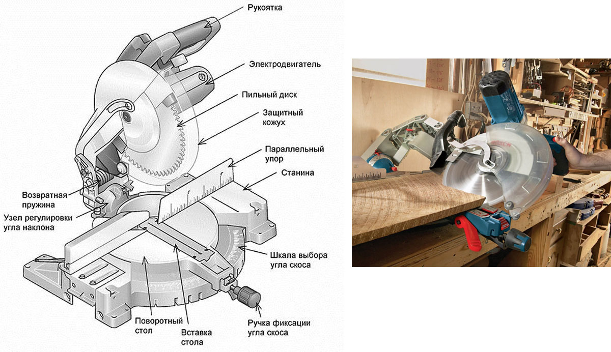 De nombreux bricoleurs qui n'ont pas suffisamment d'expérience avec de tels outils supposent à tort que la coupe ne coupe qu'à angle droit. Mais dans les appareils modernes, il est possible de couper le matériau le long de l'axe horizontal et vertical, ainsi qu'à une inclinaison définie par l'opérateur. L'outil est utilisé pour la production de meubles d'armoire à partir de bois et de matériaux en bois, de cadres de portes et de fenêtres, de stratifié, de parquet et de plinthes.