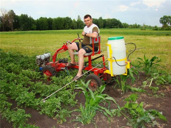 - Il est conseillé d'utiliser le pulvérisateur à moteur à essence pour les travaux sur de grandes surfaces. Le volume du réservoir de liquide varie ici de 12 à 20 litres. Les pulvérisateurs de ce type sont divisés en deux types : le sac à dos, qui se porte derrière le dos ; à roues, qui peut être déplacé librement dans le jardin et le verger.