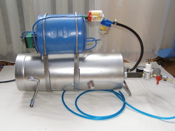 Vous aurez également besoin d'une batterie (12V) et d'un compresseur de voiture. Un trou doit être percé dans le conteneur et un mamelon de voiture inséré auquel le compresseur est connecté. Pour sceller le trou pour les rondelles, vous pouvez utiliser un joint en caoutchouc ou souffler avec du mastic. Ensuite, le compresseur doit être connecté à la batterie.