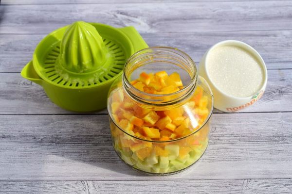 La quantité d'ingrédients est indiquée pour 500 g de potiron. Vous aurez besoin d'1 verre de sucre cristallisé, 3 oranges, 2 litres d'eau purifiée.