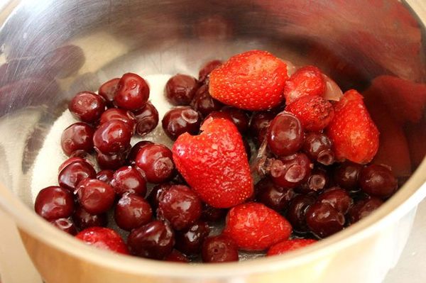 - Versez le sirop obtenu dans des bocaux de cerises et de fraises, roulez les couvercles et laissez refroidir.