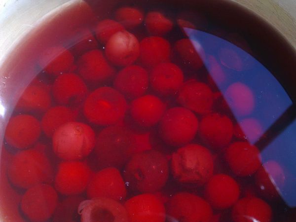 - Après ébullition, ajoutez les cerises et la rhubarbe au sirop, laissez cuire encore 15 à 20 minutes.