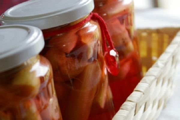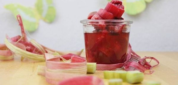 Vous devez prendre les tiges de rhubarbe et préparer le sirop. Les femmes au foyer sont guidées par le fait que 1 verre de sucre cristallisé est pris pour 1 litre d'eau. Les ingrédients sont mélangés, portés à ébullition et éteints. C'est ainsi que le sirop est préparé.