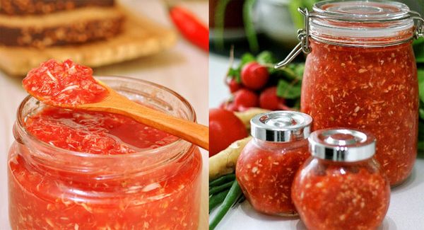 C'est l'une des recettes d'assaisonnement au feu "d'or". Il améliore la digestion et possède des propriétés antimicrobiennes. Préparé avec l'ajout de tomates. Les variétés de collations sont nommées "Khrenoder", "Gorloder", "Ogonyok".