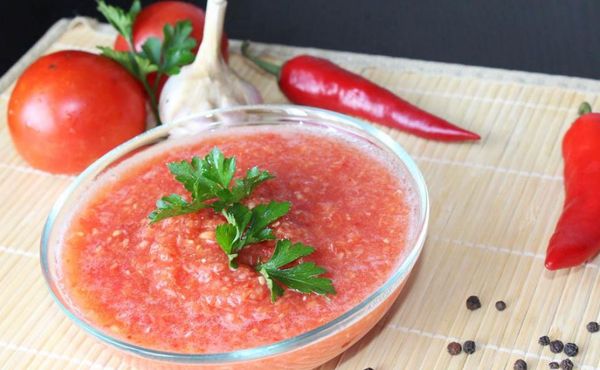 L'assaisonnement épicé et incroyablement savoureux avec des tomates et de l'ail est connu pour ses propriétés bénéfiques. Il est récolté à l'automne et consommé en hiver. La collation est utilisée comme prophylaxie contre le rhume.
