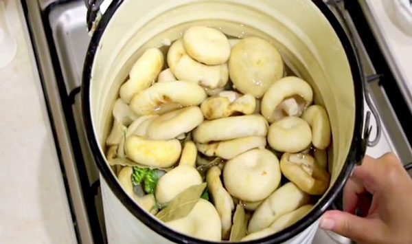 Transférer les champignons dans des bocaux préparés, verser avec de la saumure, stériliser et sceller.