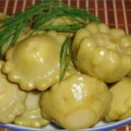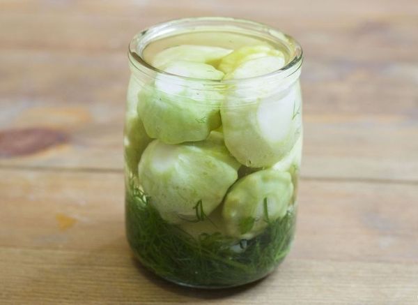 Les fruits propres sont placés dans une casserole de taille appropriée, remplie d'eau bouillante. Après 6 minutes, la courge doit être refroidie dans un récipient avec de l'eau froide. N'oubliez pas d'ajouter du vinaigre à la marinade bouillie. Une partie des légumes verts et du poivre sont placés au fond d'un pot d'un litre, les courges et les légumes verts qui restent y sont également envoyés. Après avoir stérilisé les bocaux (environ 20 minutes), ils peuvent être fermés hermétiquement avec des couvercles.