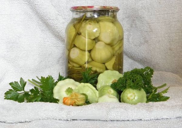 Les courges lavées sans queue sont bouillies pendant environ 3 minutes dans de l'eau déjà bouillie dans un récipient séparé, puis égouttées. La marinade est faite dans un récipient différent. Lorsque la composition bout, vous devez verser du vinaigre, mettre du poivre et des clous de girofle. Les patissons sont placés dans des bocaux, des feuilles de laurier, de l'ail pelé et haché y sont envoyés, vous pouvez ajouter de l'aneth ou du raifort. La pièce est versée avec de la marinade et fermée avec des couvercles à vis ou en nylon stériles.