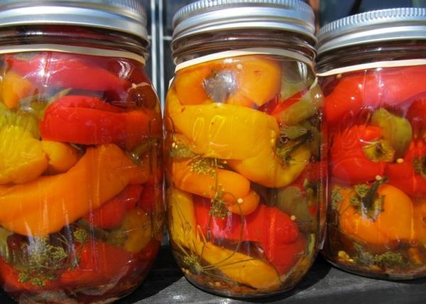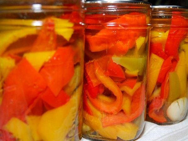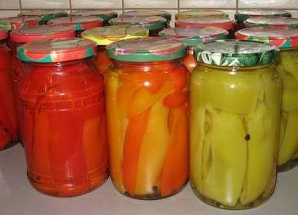 Des poivrons de taille moyenne sont utilisés, qui sont lavés, pelés du noyau et des tiges. L'eau est versée dans une casserole, le sel est versé et bouilli, les poivrons y sont blanchis pendant 3 minutes, en les laissant tomber dans un récipient pour quelques morceaux. Les légumes sont disposés dans des bocaux, versés avec une solution de marinade chaude à base d'eau, de sucre cristallisé, de sel, de grains de poivre et de céleri, il doit bouillir jusqu'à 5 minutes. Tout d'abord, du vinaigre est versé dans le récipient, après quoi les récipients peuvent être enroulés.