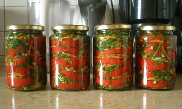 Les poivrons sont coupés en morceaux sur la longueur, puis placés en portions dans une saumure bouillante, où ils sont conservés jusqu'à ce que la couleur vive change. Après cela, ils doivent être disposés dans des conteneurs en position verticale, la couche supérieure peut être horizontale, ajouter du remplissage et s'enrouler.