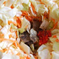 Bien rincer les légumes sous l'eau courante et les couper en morceaux moyens. Envoyez la racine de raifort, un mélange de carottes et de chou dans le pot, versez la marinade fraîchement préparée sur le dessus.