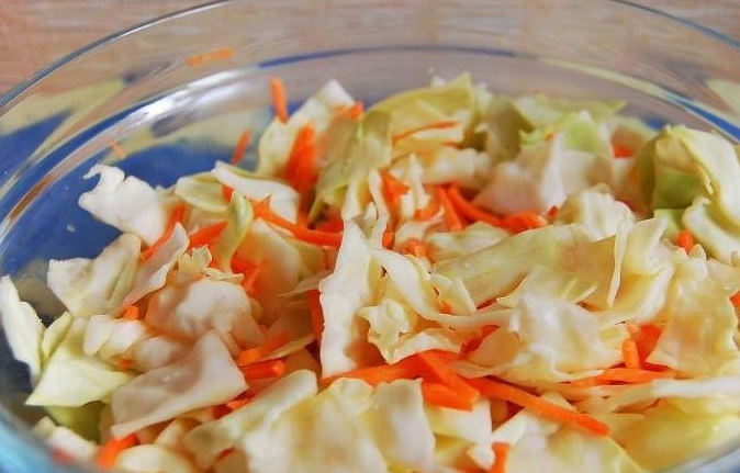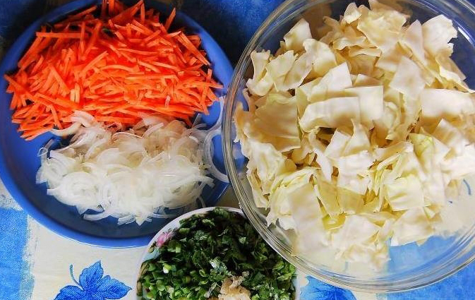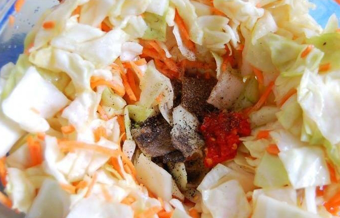 Le chou blanc doit être coupé en très grosses tranches. Hachez le reste des ingrédients : râpez les carottes, hachez finement l'ail et le poivre. Mélanger soigneusement tous les composants jusqu'à ce qu'un mélange homogène se forme. Ajouter l'essence de vinaigre. Envoyez le tout dans une poêle bien chauffée.
