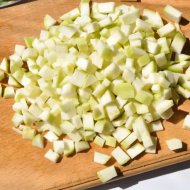 - Eplucher les courgettes et les couper en petits cubes. Incorporer le sucre et laisser reposer quelques heures. Si laissé plus longtemps, alors réfrigérer.