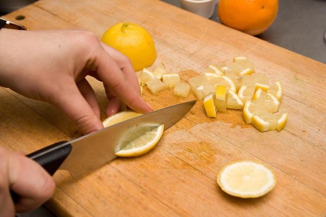 - Hacher finement le citron. Si la peau est épaisse, râpez le zeste, retirez l'enrobage blanc amer et hachez la pulpe. On ajoute des agrumes lors de la dernière cuisson.