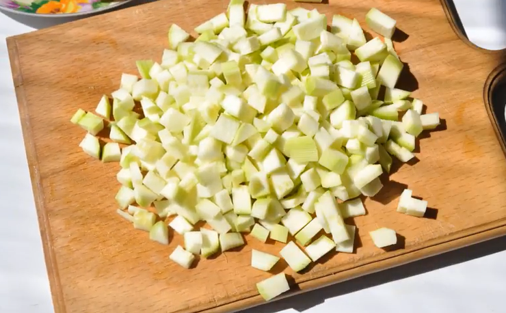 - Couper les courgettes en petits cubes et les mettre dans un récipient de cuisson en couches, saupoudrer de sucre.