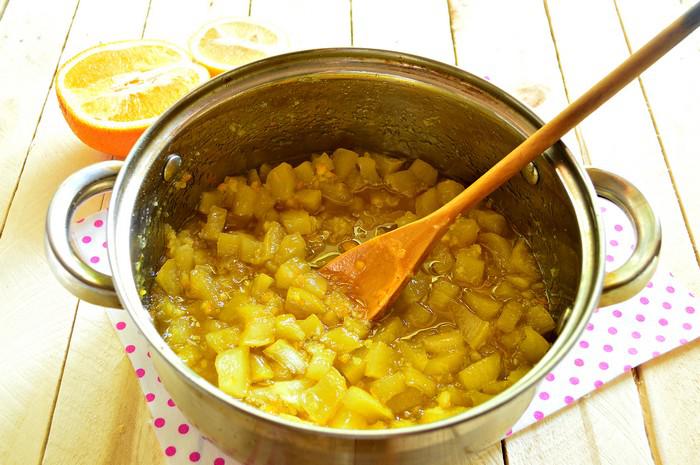 Ingrédients requis: courgettes - 1 kg, sucre - 400 g, une demi-cuillère à café de cannelle, gingembre râpé, citron, 20 g de pectine, 100 ml de cognac, 4 c. l. l'eau.