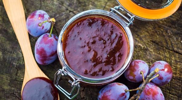 L'acidité, l'arôme agréable et la couleur plus vive donneront le dessert aux prunes. Pour 1 kg de pommes préparées, prenez 1 kg de prunes, 1 kg de sucre, 1,5 à 2 verres d'eau.