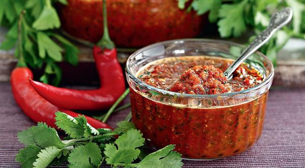 L'adjika abkhaze peut être préparé comme préparation pour l'hiver ou sans utilisation de températures élevées. Il se marie bien avec les plats chauds.