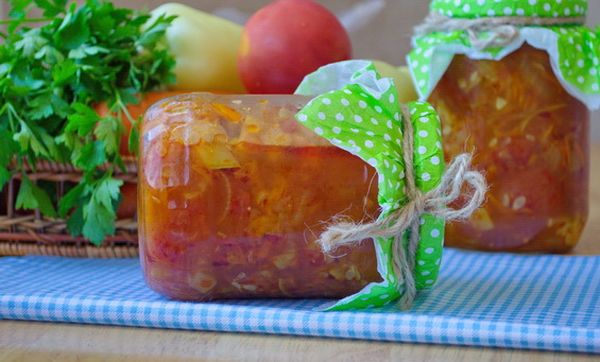 Les tomates doivent être blanchies pendant une minute, elles sont utilisées sans la peau. Les poivrons sont pelés et coupés en lanières, tout comme les oignons et les courgettes. Les tomates sont coupées en morceaux de n'importe quelle forme, les carottes sont râpées sur une râpe grossière. La marinade est préparée à partir de sauce Krasnodar, de sucre cristallisé, de sel et d'assaisonnement (environ 5 minutes après ébullition). Les courgettes y sont versées et mijotées pendant 10 minutes, le poivre et l'oignon sont ajoutés, bouillis pendant environ 15 minutes de plus. À la fin, des tomates et de l'aneth ou du persil hachés sont placés dans le plat au goût. Il reste à ajouter du vinaigre et de l'acide, à faire bouillir le plat pendant quelques minutes et la salade est prête à être emballée dans des bocaux.