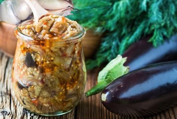 Les aubergines sont coupées en carrés, blanchies pendant 3-4 minutes, laissées s'égoutter, mises dans un grand bol avec la vinaigrette. Pour la vinaigrette, hachez finement l'aneth, hachez l'ail, remuez le tout avec l'huile, le sel, le vinaigre. Le contenu soigneusement mélangé des plats est disposé dans des bocaux, placés au réfrigérateur, vous pouvez manger le lendemain matin.