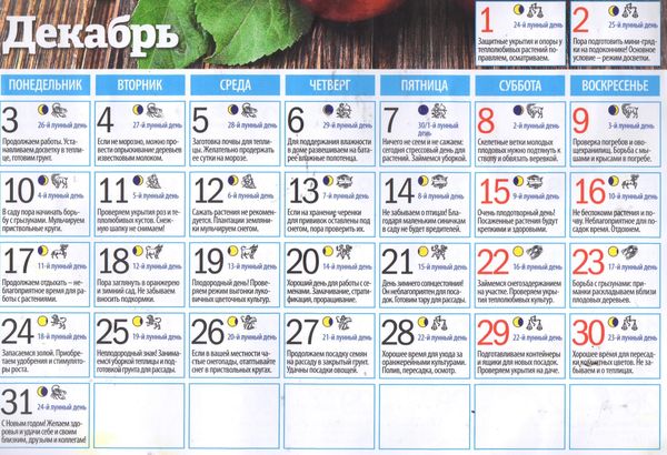 - 11-13 décembre. Jour lunaire - 5-7. Signe du zodiaque - Verseau. La phase grandit. Sur le site, inspectez les semis, disposez les pièges à souris. Retirer les déchets excédentaires du territoire. Vérifiez la sécurité de la culture.