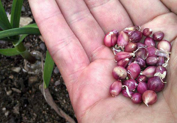 La culture avec des bulbes prend deux ans: la première année, un bulbe à une seule dent en pousse et, dans la seconde, une tête d'ail à part entière avec 5 à 9 gousses. Vous pouvez également utiliser des dents à une dent, mais il est préférable de les laisser pour la reproduction.