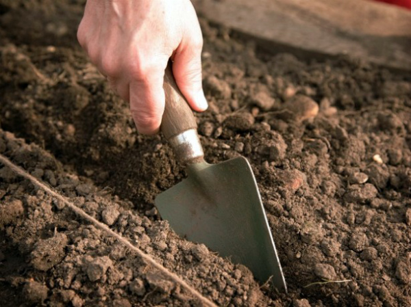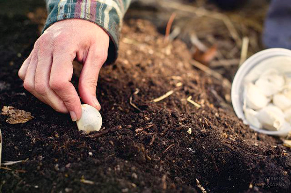La plantation des dents pour l'hiver s'effectue dans des conditions strictement définies. Sur le lit préparé, faites des sillons longitudinaux de 10 à 15 cm de profondeur. La distance entre les rangs doit être d'au moins 15 cm. Pour protéger les dents de la carie prématurée, une couche de sable (2-3 cm) est versée au fond de le sillon, après quoi, à une distance de 8 à 10 cm, chaque dent ou bulbe est planté chez un ami. Ensuite, le semis est recouvert de terre, légèrement compactée.