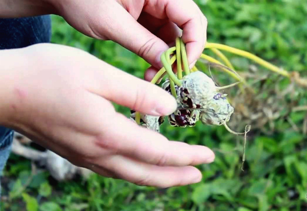 - en déterrant le bulbe, vous pouvez observer une tête solide et bien formée avec des dents bien définies, recouverte d'écailles denses mais sèches.