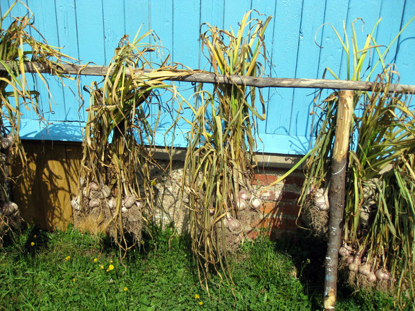 Laissez-vous guider par l'état des feuilles et des flèches de l'ail, elles vous indiqueront le bon moment. Initialement, la flèche que la plante libère est enroulée en spirale. Plus la période de maturation du bulbe est proche, plus la flèche se redresse. Pour éviter de casser la tige et la pourriture ultérieure, il est nécessaire de couper la flèche, puis d'attacher les feuilles en tresse. Il est à noter que les jeunes flèches d'ail peuvent être consommées en les ajoutant à une salade ou à des marinades.