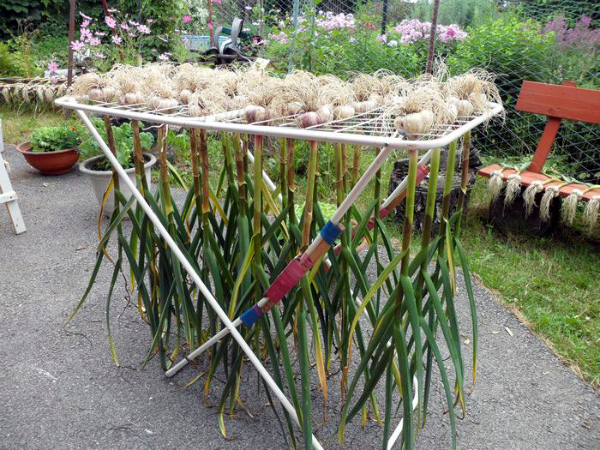 Les têtes creusées sont laissées à sécher directement dans le jardin si le temps est sec. Vous pouvez les déplacer sous le toit, mais vous avez besoin d'air frais, mieux avec une brise. Ce moment de séchage complète la maturation et l'entretien de l'ail. Après une semaine, la récolte est récoltée à l'intérieur et séchée au point que le lobe de la racine peut être facilement frotté avec les doigts.