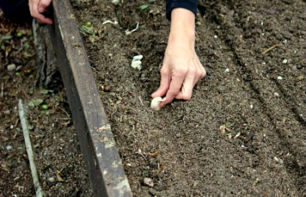 - Ensuite, nous plantons les gousses d'ail avec le bas vers le bas à une distance de 10-12 cm pour les gros spécimens, et de 8-10 pour les plus petits.