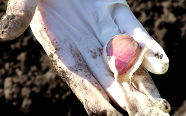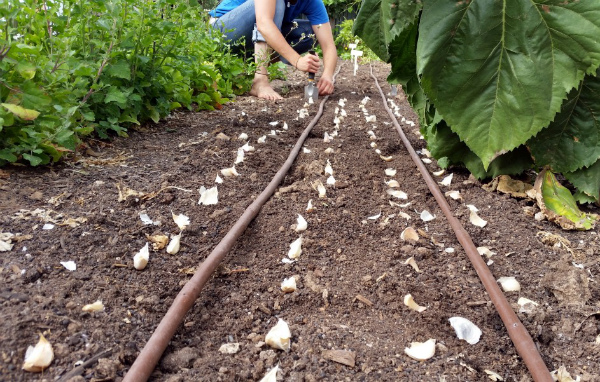 Les dents sont approfondies de sorte qu'il reste 4 à 5 cm à la surface du sol. Avec une plantation moins profonde, elles peuvent geler. De plus, les sillons sont recouverts de terre, un peu compactés et recouvrent le lit d'une couche de 2 à 3 cm de paillis de matière organique - tourbe, humus.