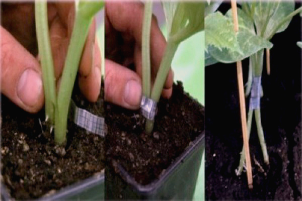 Par exemple, si l'inoculation est réalisée dans une incision latérale, alors elle se fait sur la tige à différents endroits. Si le porte-greffe est dans la première phase foliaire, l'incision est faite à travers le genou hypocotal du côté opposé. Dans ce cas, la feuille elle-même et le point de croissance sont coupés. Le greffon doit être coupé à partir de la racine dans la phase cotylédonienne. Sur le genou hypocotylédone, une fine couche de peau est coupée, dont la longueur est identique à la coupe sur la tige du stock. Pour ouvrir l'incision sur le porte-greffe, la tige est pliée, un greffon y est inséré, dont l'extrémité doit pénétrer le plus étroitement possible dans l'incision du porte-greffe. Le site de vaccination est étroitement lié, mais pas trop.