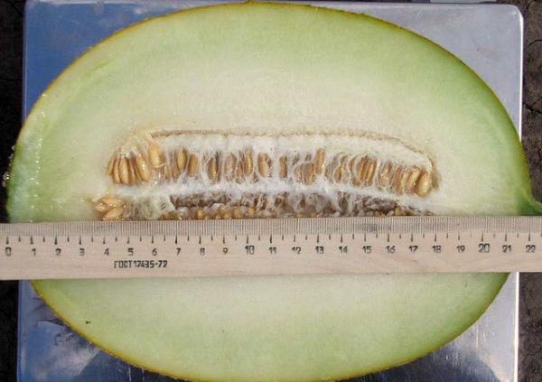 Cependant, cette variété est appréciée non seulement pour l'immunité, mais également pour les gros fruits, dont le poids moyen varie de 2,5 à 3 kilogrammes et, avec une combinaison de circonstances réussie, atteint 4 kilogrammes. Les fruits d'Amal sont allongés, la peau est jaune crème, dense et lisse, avec une fine maille continue. La pulpe est un peu plus foncée que la peau, de couleur crème riche, très tendre et juteuse avec une forte odeur. Mais la chambre où se trouvent les graines est petite. 100 grammes de pulpe de melon contiennent jusqu'à 11% de matière sèche et environ 7% de sucre.